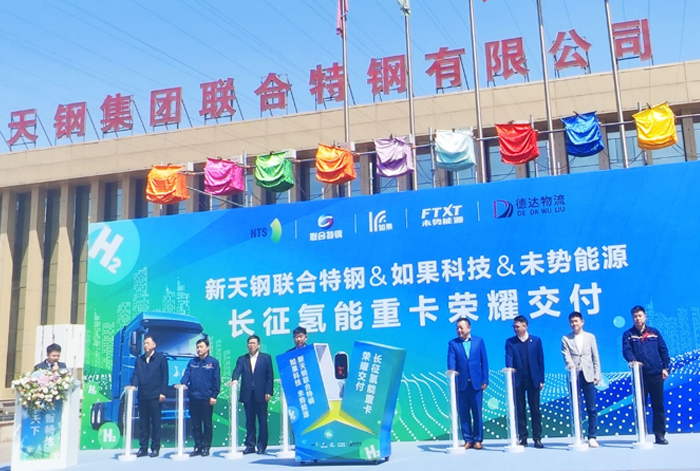 4月18日,未勢(shì)能源、如果科技與新天鋼集團(tuán)聯(lián)合特鋼在天津舉辦“長(zhǎng)征氫能重卡榮耀交付”活動(dòng),這是未勢(shì)能源聯(lián)合產(chǎn)業(yè)鏈伙伴共建市場(chǎng)生態(tài)、共推氫車(chē)應(yīng)用的又一實(shí)質(zhì)性成果,也是三方共同發(fā)力氫能清潔運(yùn)輸,為天津“生態(tài)立區(qū)”注入綠色新動(dòng)力的一次落地示范行動(dòng)。